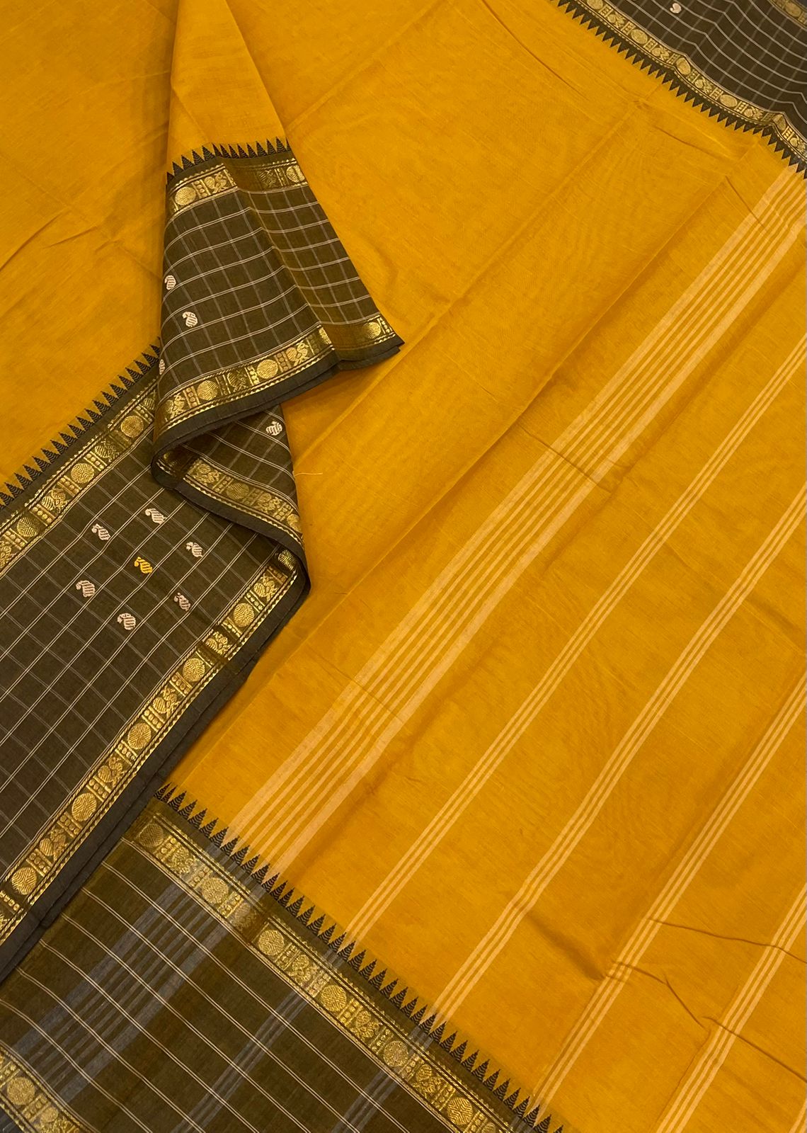 Kanchi soft cotton |rich rettaipet kattam zari border | manjal x greyish earth green