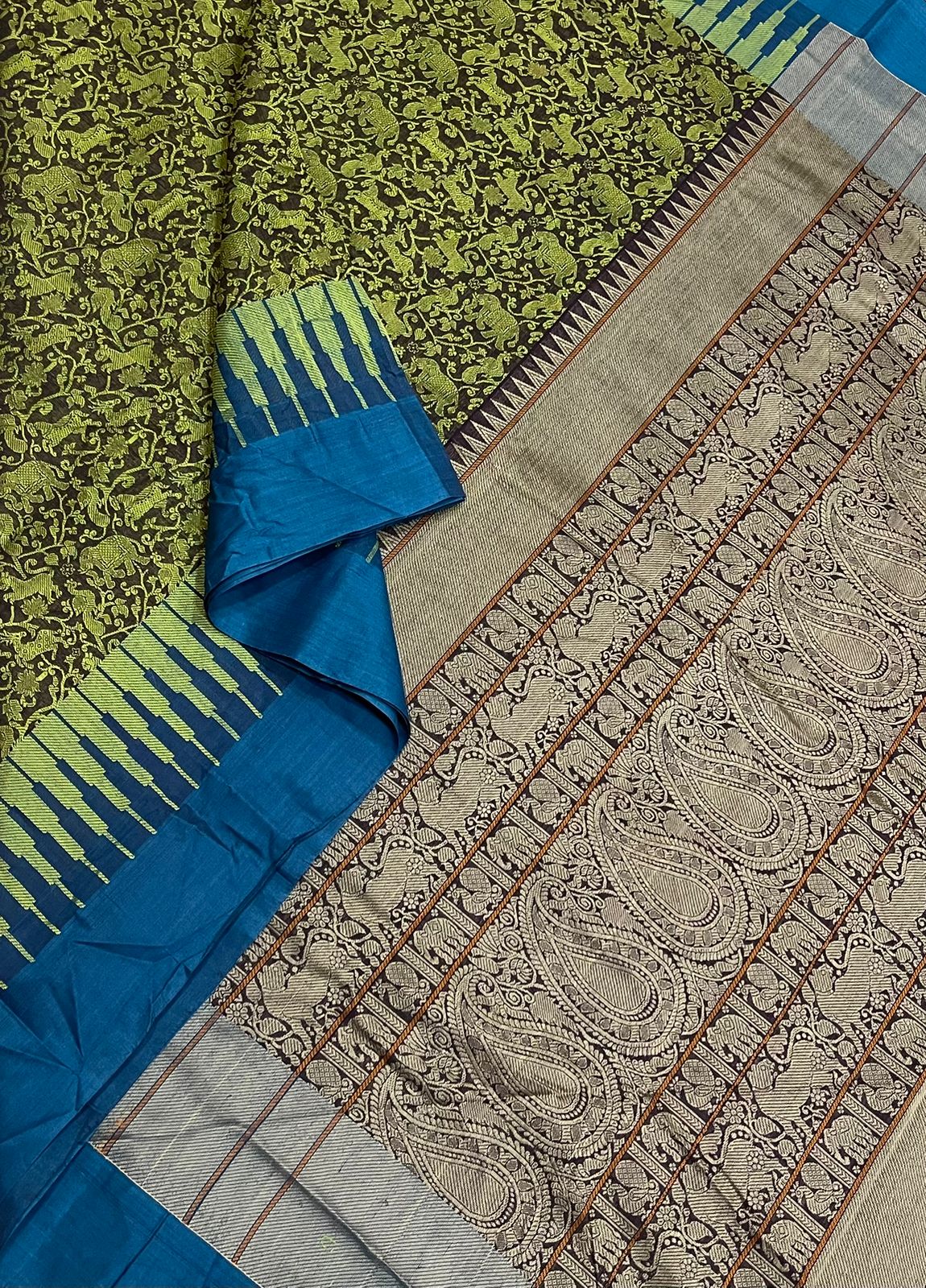Kanchi handloom rich cotton | Vanasingaram | brown x green x Blue |NKV56