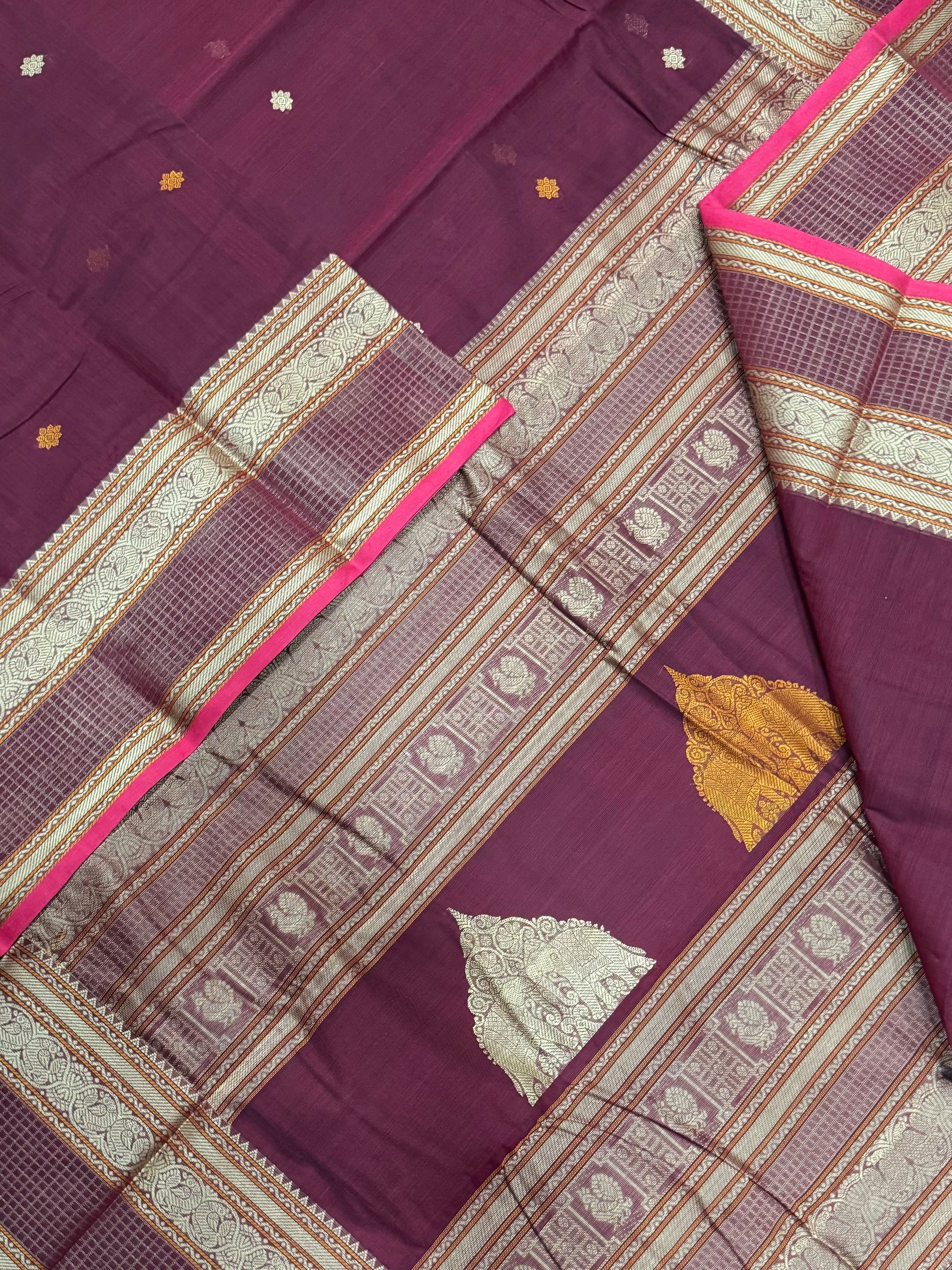 Kanchi handloom rich cotton |elephant palli motif X thread border | pastel grey x cyan blue