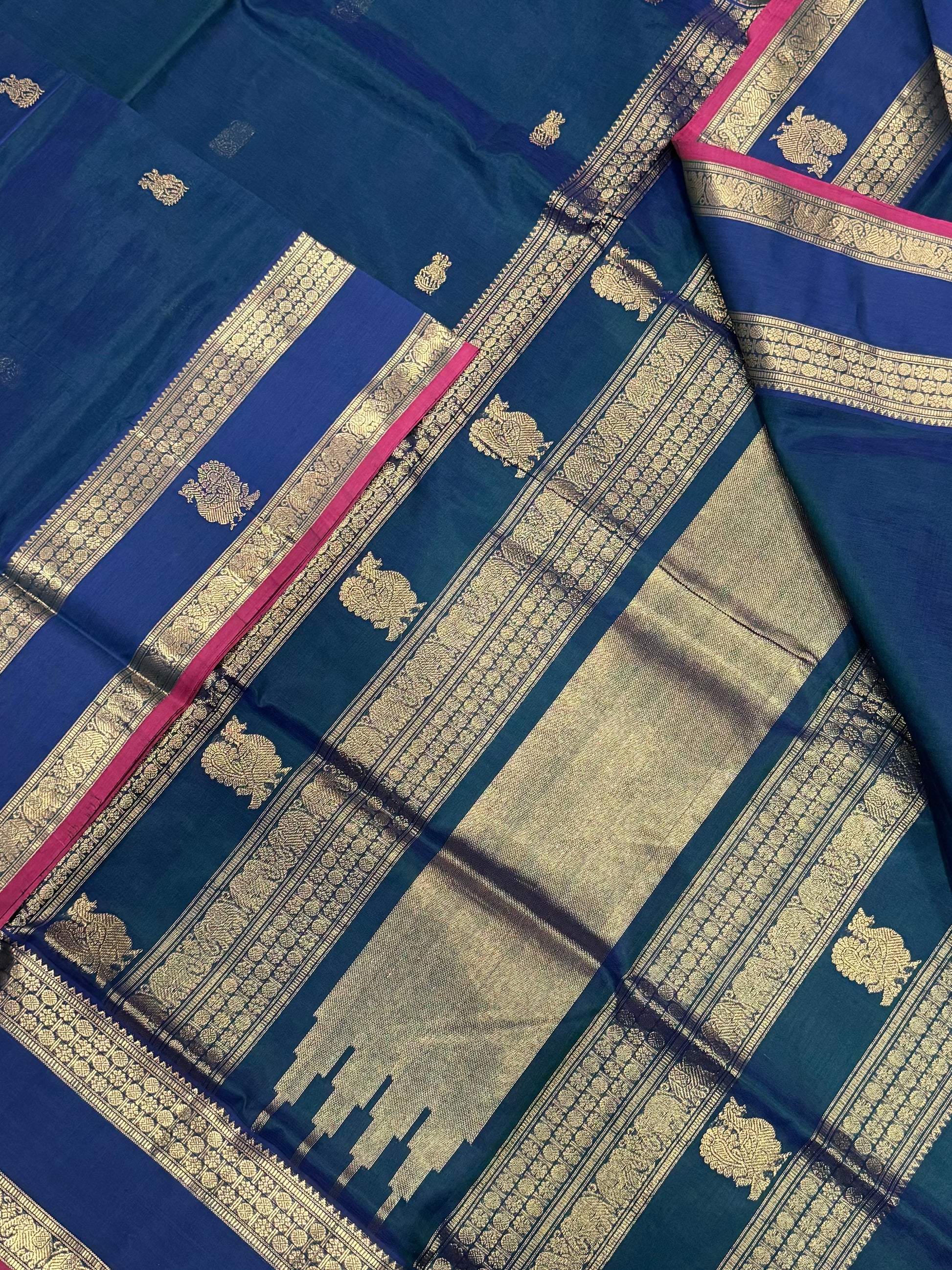 Kanchi Silk Cotton Sarees | mayil BUTTA x rettaipet border | peacock blue X red