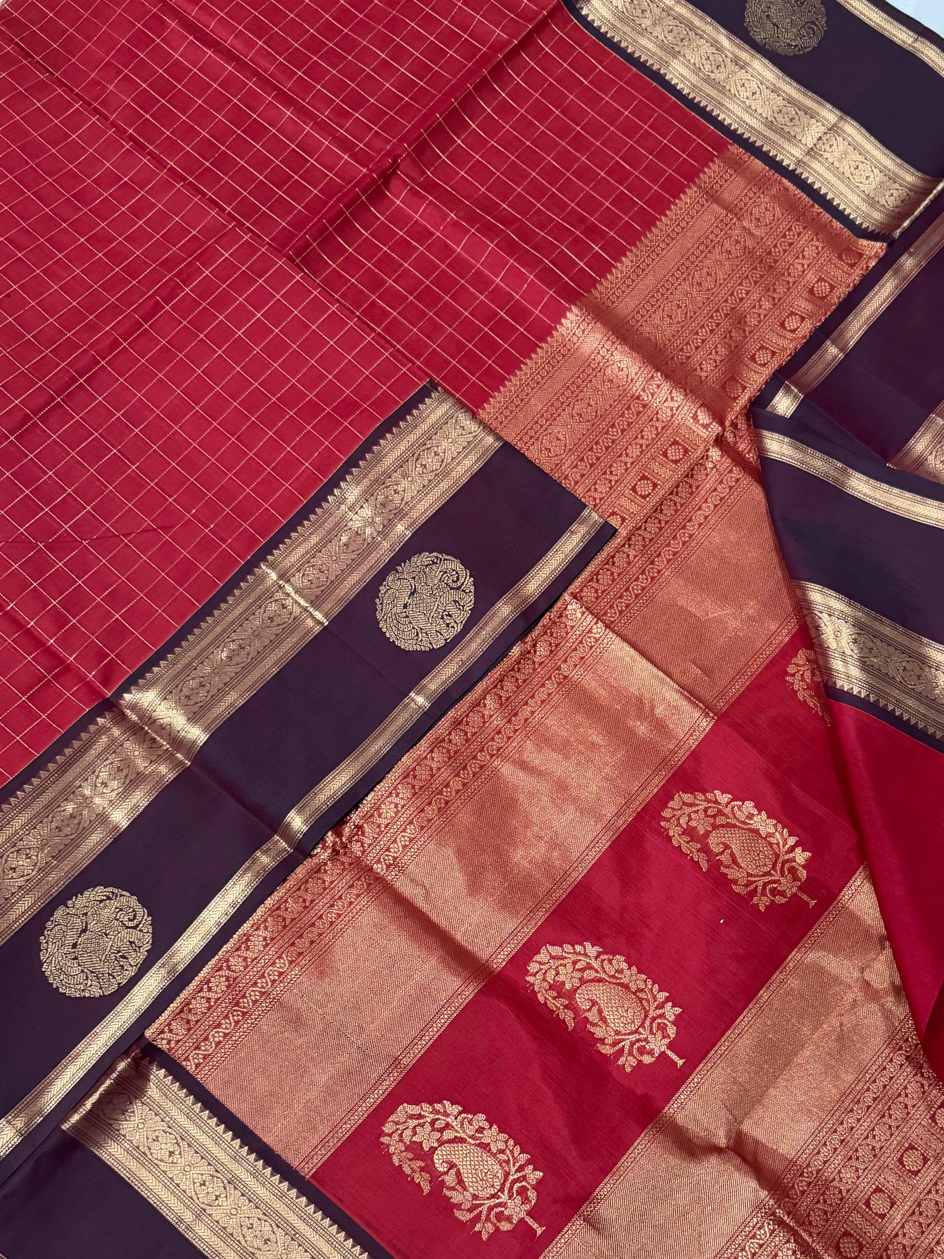 Kanchi Silk Cotton Sarees | kattam X yaanai mayil Zari border | red x aaraku zari border | NKV20