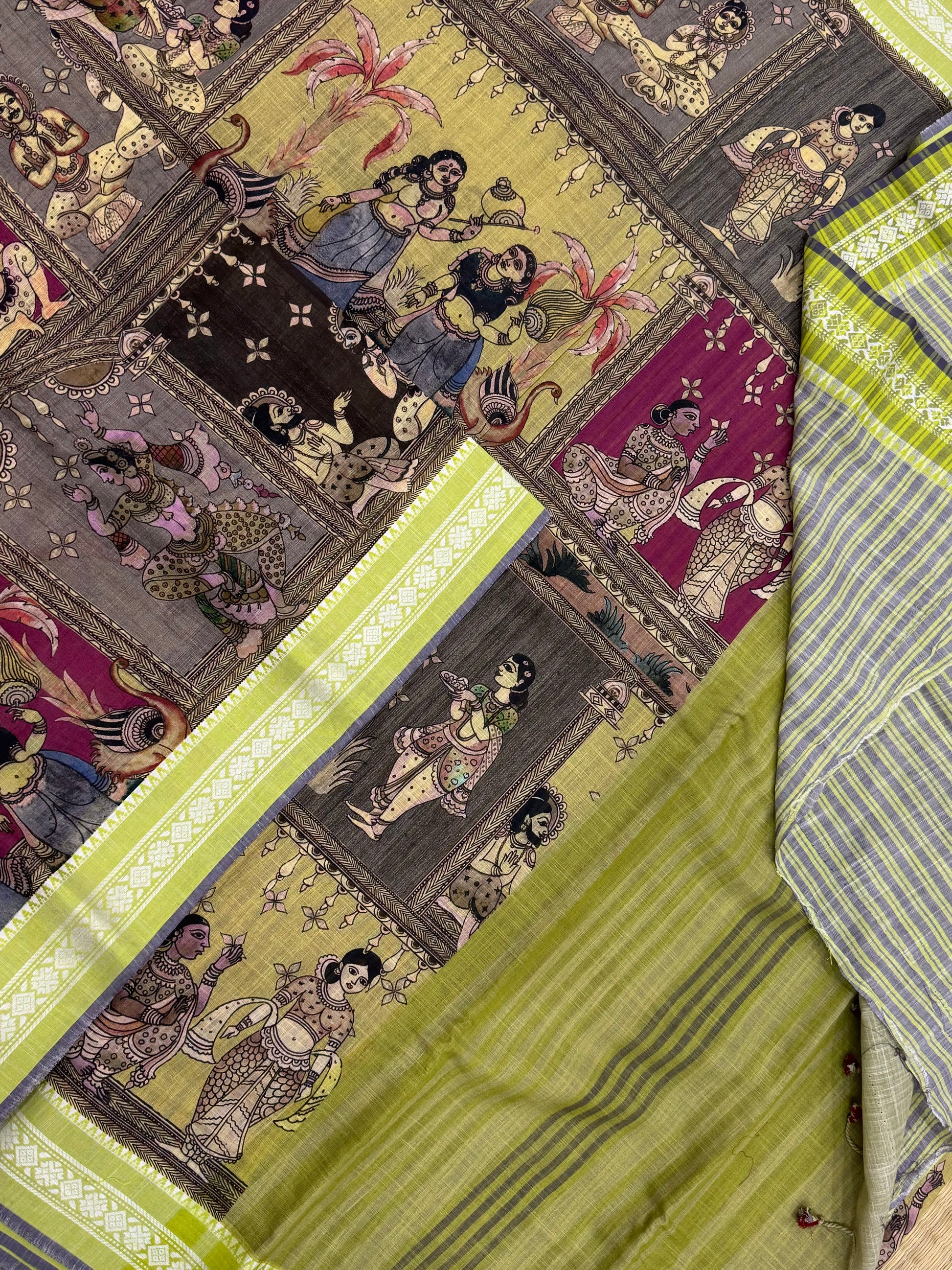 Ponduru feather soft cotton | story telling saree | brown x pink X green