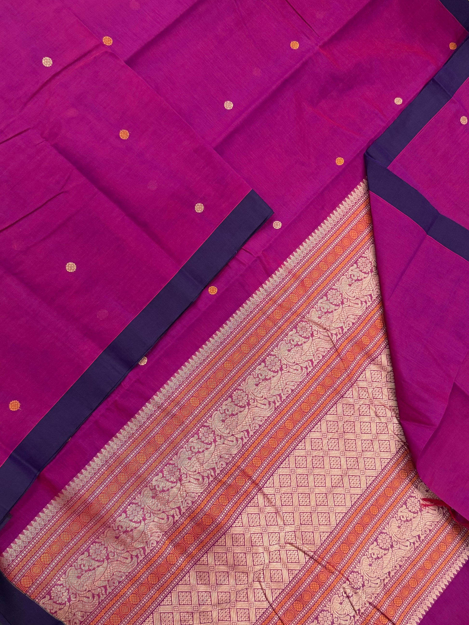 Embrace the beauty of tradition with our Handloom Rich Cotton Saree featuring Rich silk border with rettaipet temple border motifs design. Experience comfort and elegance, a perfect fusion of heritage and style.