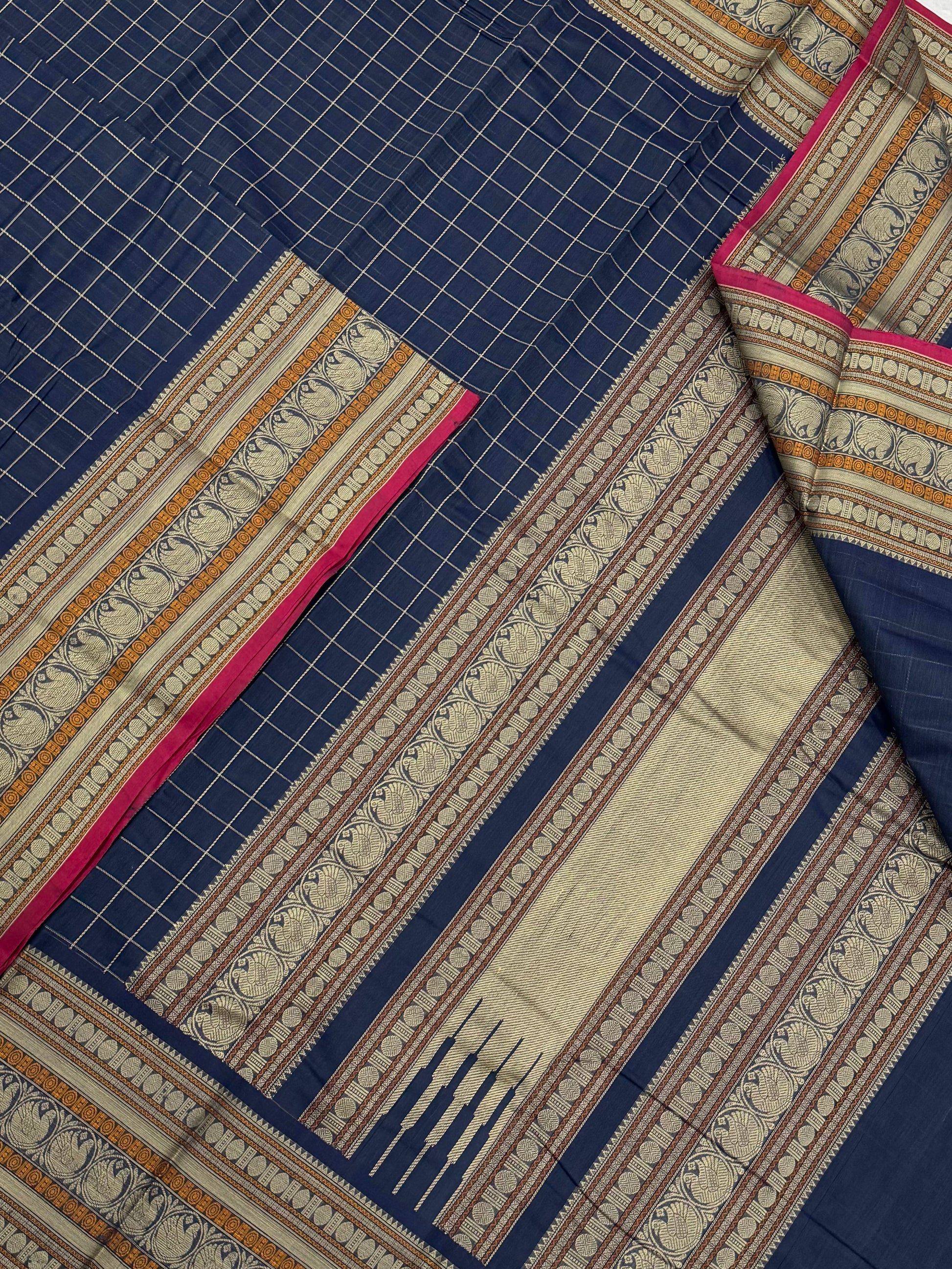 Pure Handloom Kanchi rich Cotton Saree | thread border X thread kattam | blue X red | rich thread woven Pallu
