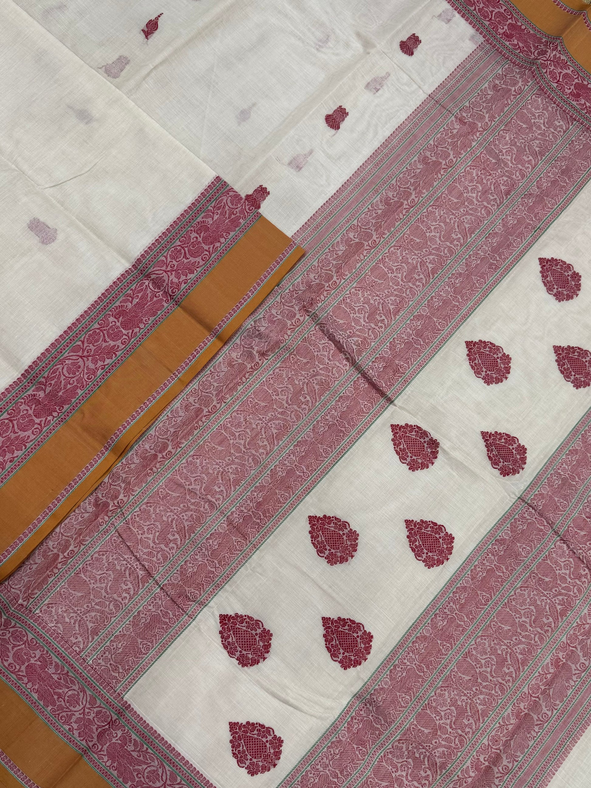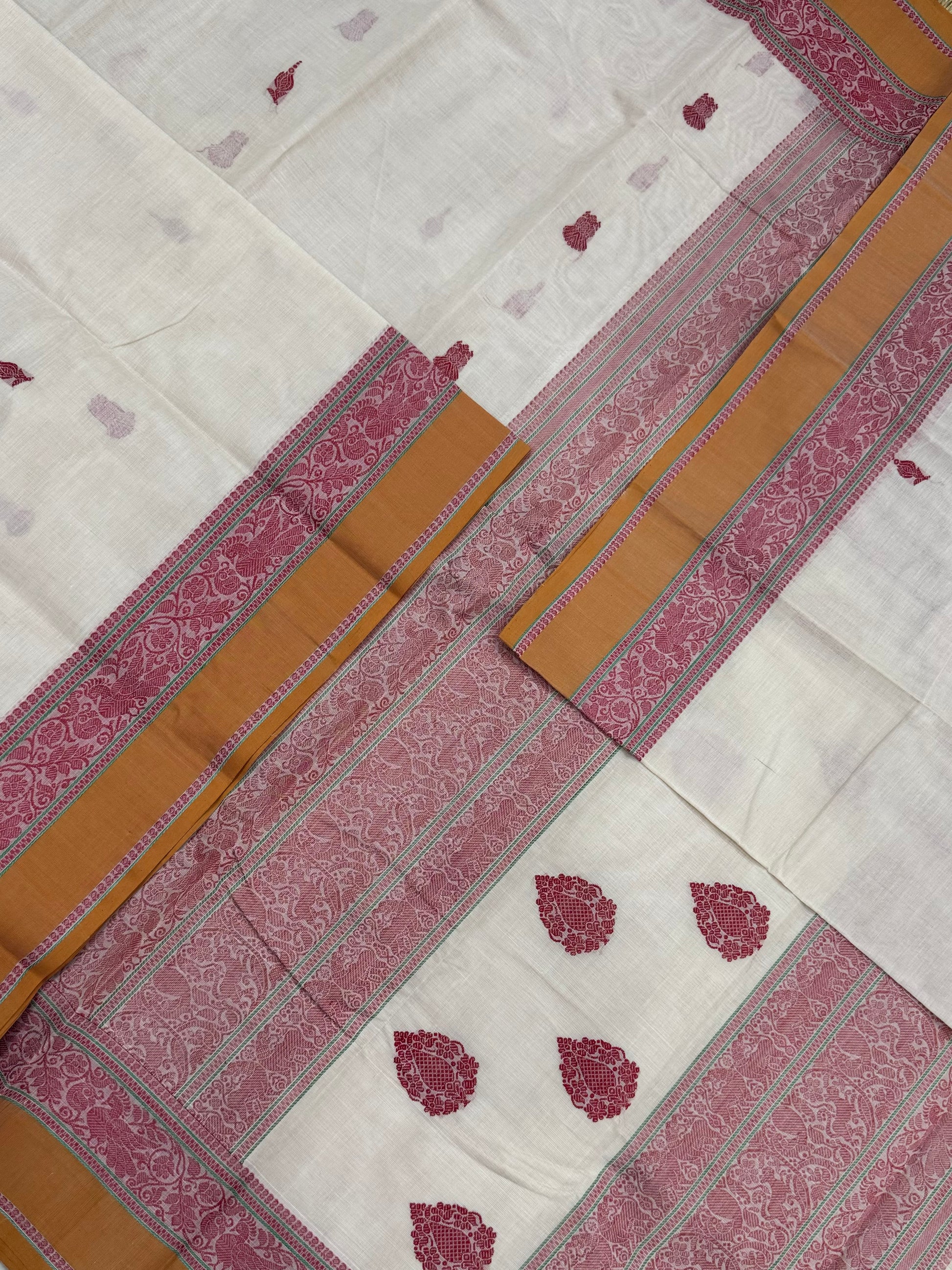 Pure Handloom Kanchi rich Cotton Saree | thread border X eruthalapakshi butta| half white X red X mustard | intricate thread woven Pallu