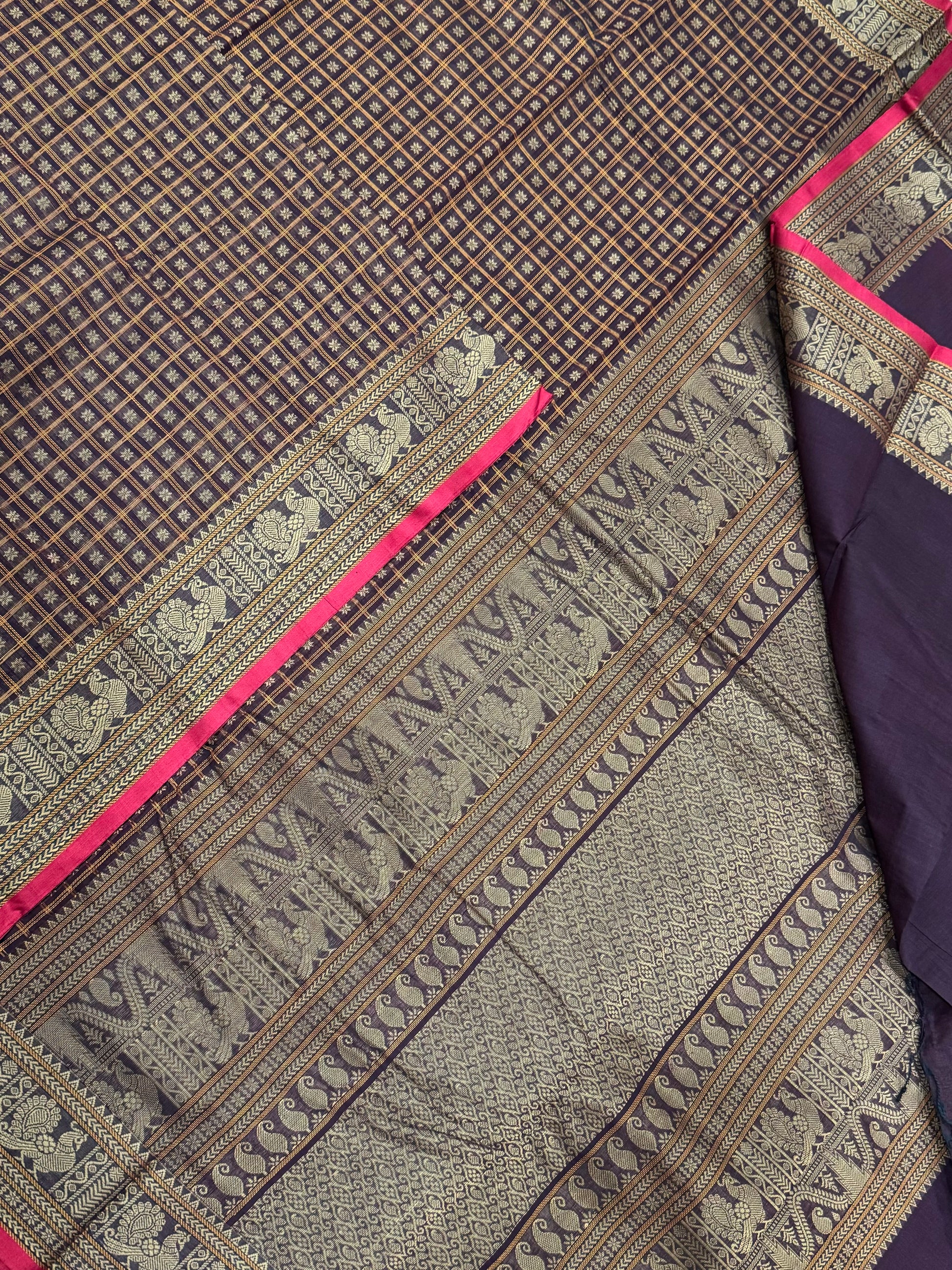 Pure Handloom Kanchi rich Cotton Saree | thread woven X 1000 BUTTA |chocolate brown X red | intricate rich thread woven Pallu & borders