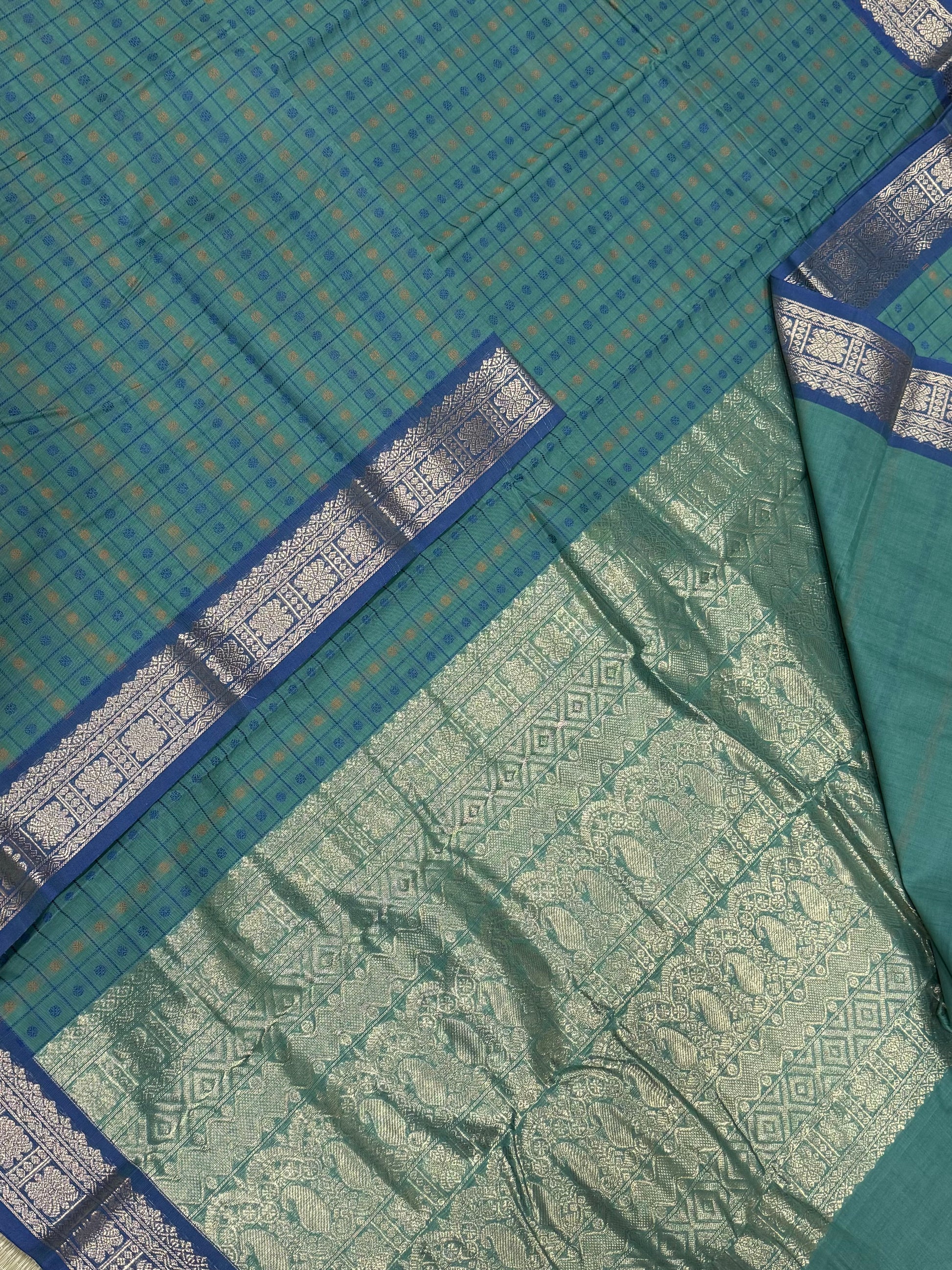 Pure Handloom Kanchi rich Cotton | thread woven X 100 BUTTA |aqua green X blue | intricate rich thread woven Pallu & borders