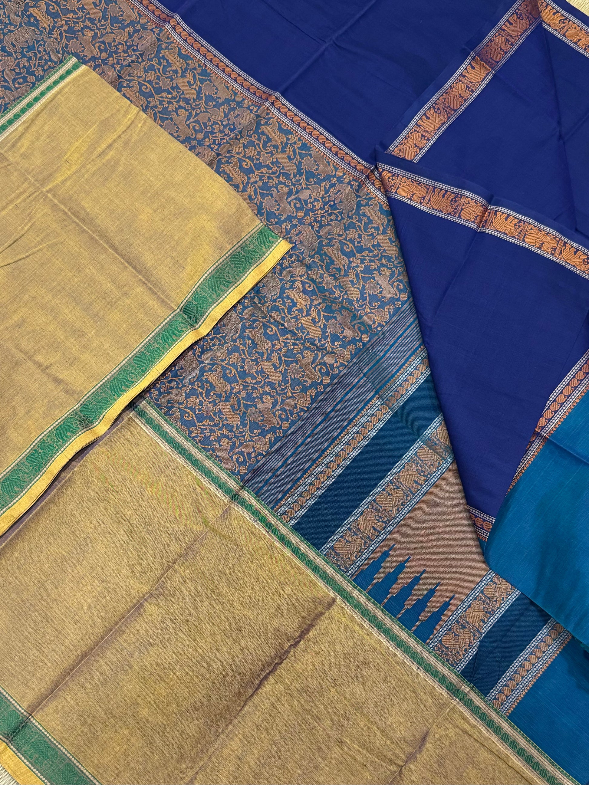 Pure Handloom Kanchi rich Cotton Saree | thread woven X muppagam X vanasingaram | blue X mustard | intricate rich thread woven Pallu