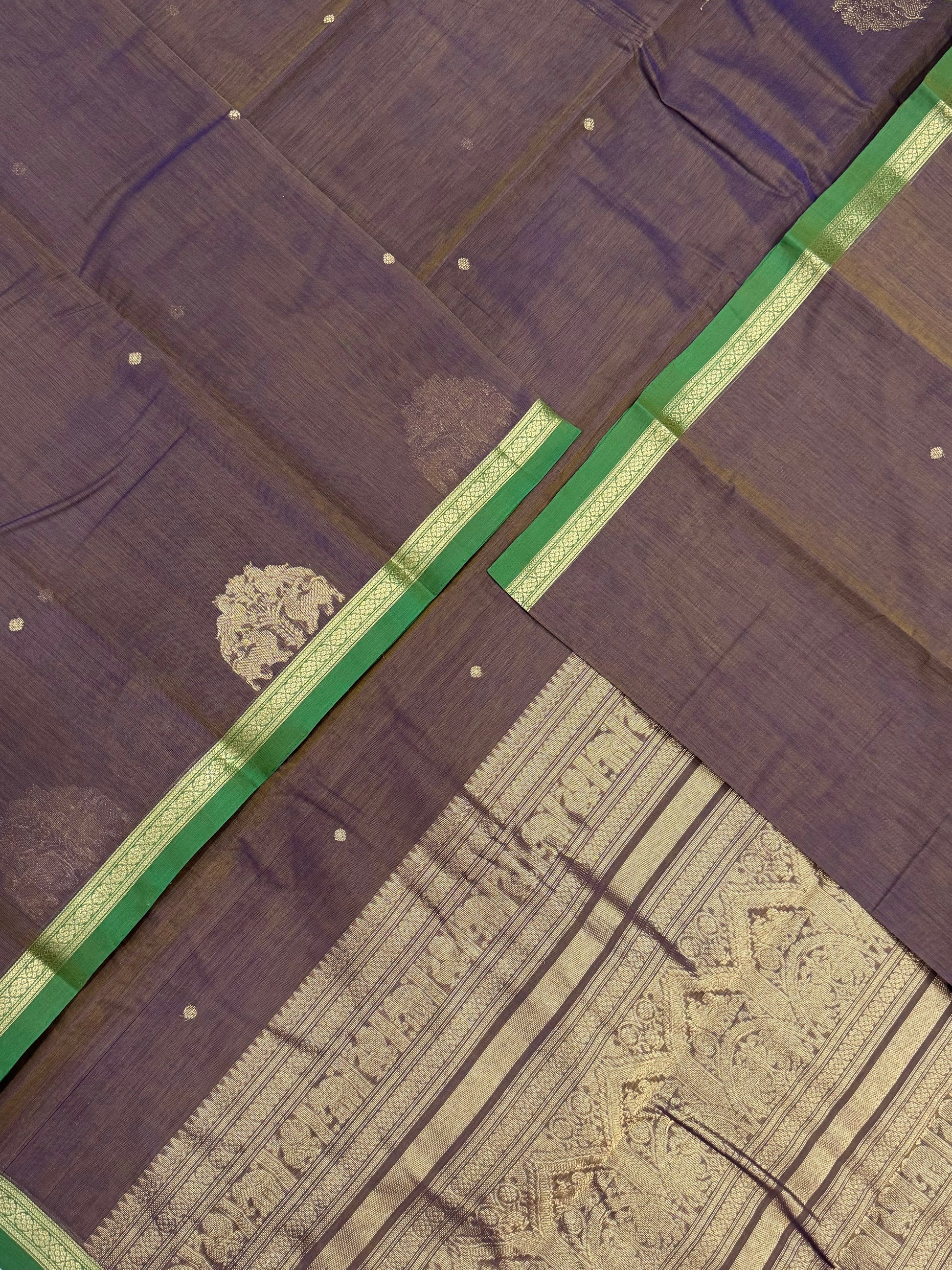 Pure Handloom Kanchi rich Cotton Saree | tiny Zari border X mayil yhazli X mayil butta| two tone brown X green | intricate Zari woven Pallu