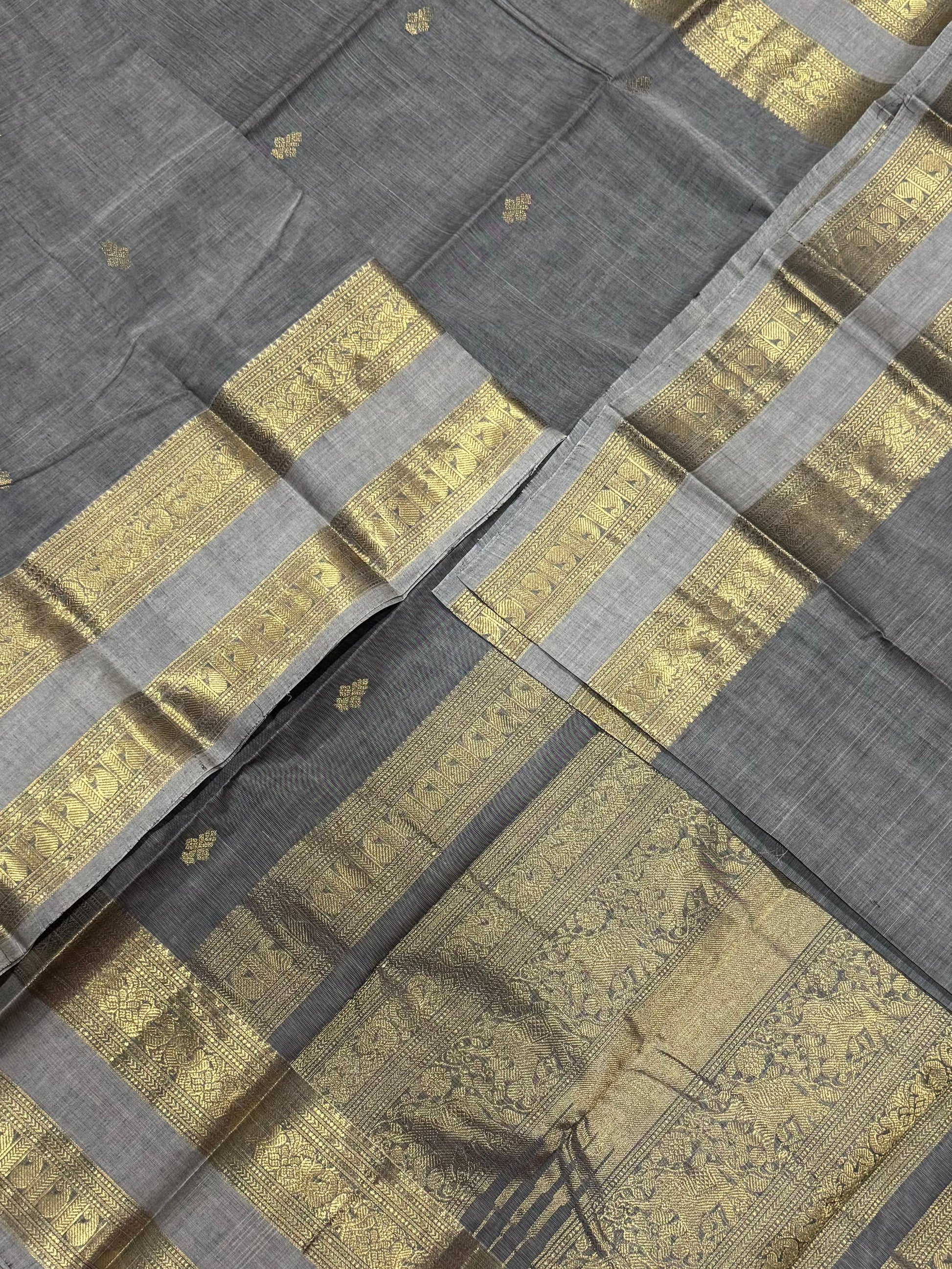 Pure Handloom Kanchi rich Cotton | Zari woven X rettaipetborder |pastel grey | intricate rich Zari woven Pallu & borders