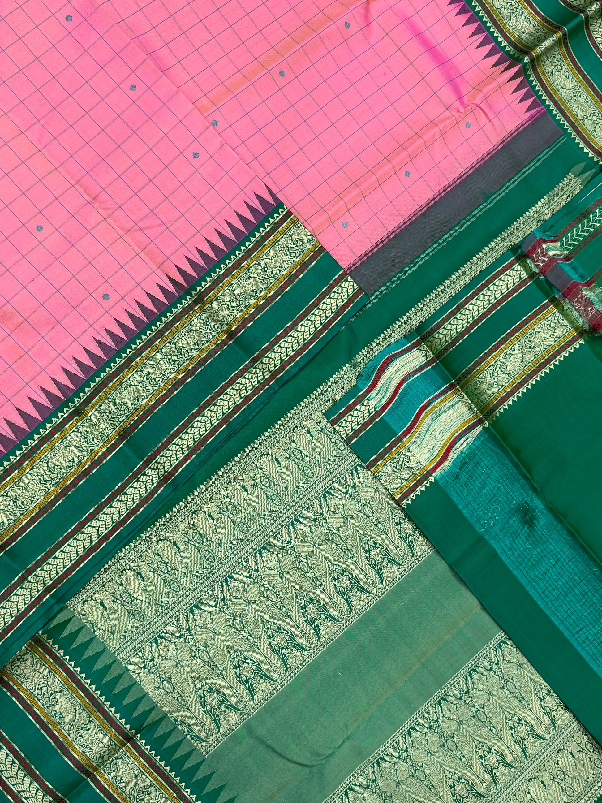 Pure Kanjivarams | korvai zero zari | kattam X tiny killi pallu |pastel pink x dark green | Handwoven luxury x 4 ply master weave | NKV35