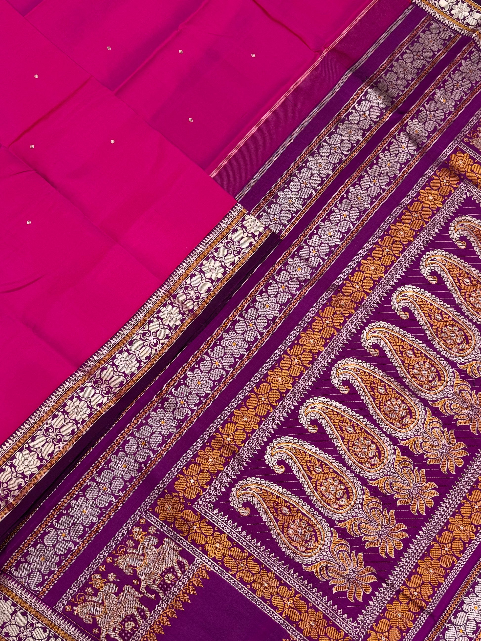 Pure Kanjivarams | zero zari | balucharry pallu |hot pink X violet | Handwoven luxury x 4 ply master weave | NKV35